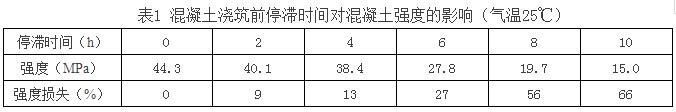(6)在初凝時間內的混凝土,由于氣溫較高、運距較遠、壓車時間較長等造成混凝土坍落度損失較大,可通過試驗添加同型號的泵送劑或減水劑,但添加與原先已加的總和摻量不能超過外加劑最大摻量的20%。應逐漸添加,先少加,摻入后,攪拌運輸車必須快速轉動2min左右,測定坍落度符合要求。運到現場的混凝土不能立即卸料,應快速轉動運輸車2min后卸料,以確保坍落度和質量。對超過初凝時間的混凝土應廢棄,不能再使用。混凝土澆筑前停滯的時間越長,混凝土強度損失越嚴重(如表1),應當引起足夠重視。