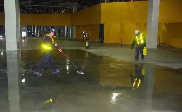一旦混凝土表面的張合力被打開,混凝土經過20到40多分鐘來吸收硬化劑。接著,可以對同一時間段進行施工的整個區(qū)域做一個評估。如果大多數材料都已經滲透到混凝土里,那就就將剩下的材料從濕潤區(qū)域勻到干燥區(qū)域。在起粘稠區(qū)域處添加點水,把地面刷均勻,然后讓它自然干。如果材料已經全部滲透進去,表面沒有任何殘留物,那就不需要再清洗地面了。