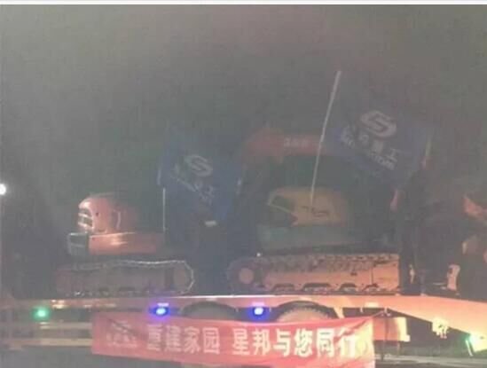 當(dāng)晚在重災(zāi)區(qū)壩塘鎮(zhèn),星邦重工組織的6臺(tái)挖機(jī)連夜運(yùn)到,同時(shí)到達(dá)的還有災(zāi)區(qū)急需的物資。