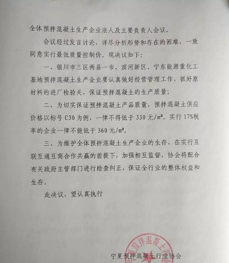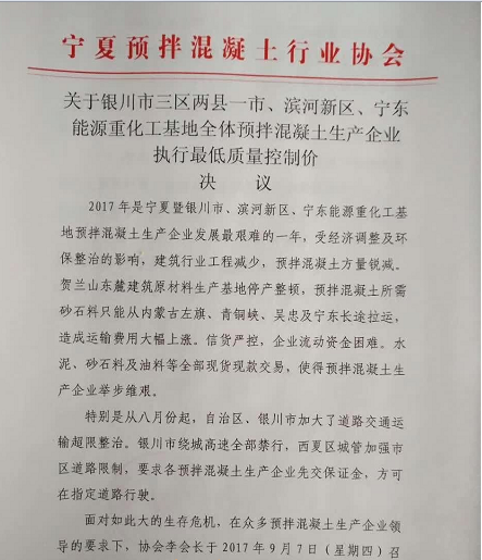 面對如此大的生存危機,寧夏混凝土協(xié)會于9月7日召開了銀川市三區(qū)兩縣一市、濱河新區(qū)、寧東能源重化工基地全體預(yù)拌混凝土生產(chǎn)企業(yè)法人及主要負責人會議。會議一致同意實行最低質(zhì)量控制價。預(yù)拌混凝土供應(yīng)價格以標號C30為例,一律不得低于330元/方,實行17%稅率的企業(yè)一律不能低于360元/方,以切實保證當?shù)仡A(yù)拌混凝土質(zhì)量。