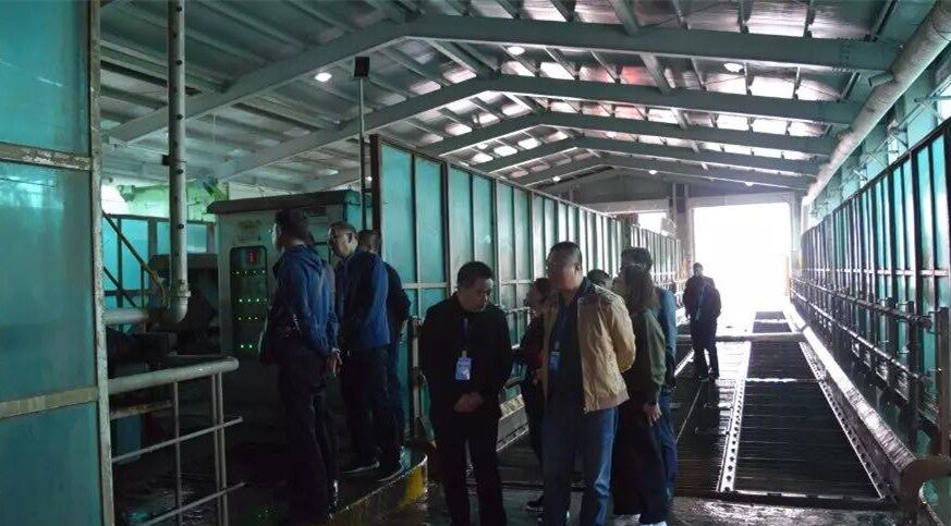 10日下午考察團一行到達韓國最大的垃圾填埋廠,首先參觀生活食品垃圾運輸車輛沖洗設備,此套設備由兩組車輛沖洗線構成,每條線長度為50米,當車輛駛入至感應區(qū)設備自動啟動對車輛全方位立體式沖洗,沖洗中掉落的異物經特制排泥裝置送至中央皮帶輸送機。車輛完成沖洗后駛出前對車身噴淋消毒去異味藥劑,最后烘干后離開。每日完成一千車次的清洗消毒工作。
