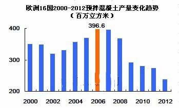根據(jù)相關(guān)數(shù)據(jù)統(tǒng)計,2006年歐盟預拌混凝土年產(chǎn)量3.96億立方米,達到近年高峰值,之后產(chǎn)量逐年下降,2012年預拌混凝土年產(chǎn)量僅2.4億立方米。