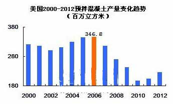 美國2000-2012年預拌混凝土產(chǎn)量變化趨勢(百萬立方米)