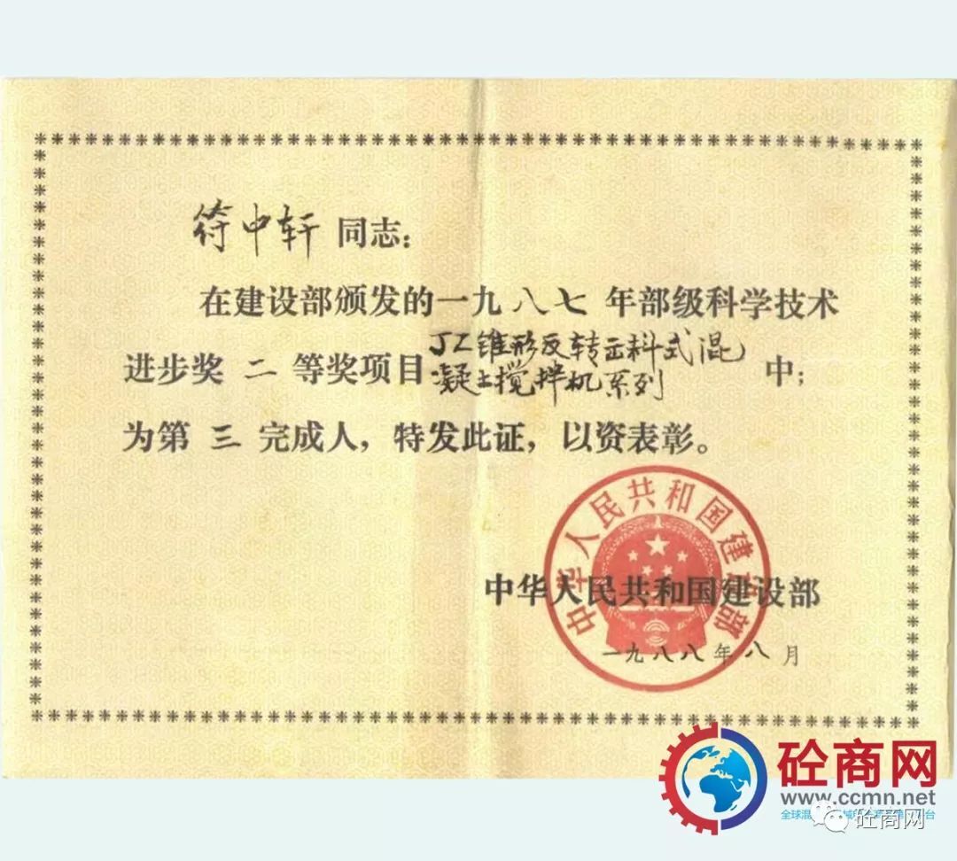 通過全行業(yè)的不懈努力,改革統(tǒng)型機型的結(jié)構(gòu)與技術(shù),新型混凝土攪拌機取得了突飛猛進的發(fā)展,并在全國推廣使用,獲得用戶廣泛的認(rèn)可與好評。長沙建機院負責(zé)的、本人作為主要參與設(shè)計者的“JZ錐形反轉(zhuǎn)出料攪拌機系列”獲建設(shè)部1987年科技進步二等獎;代表長沙建機所與方圓集團合作開發(fā)的JZC750混凝土攪拌機,獲得國家科技成果證書。