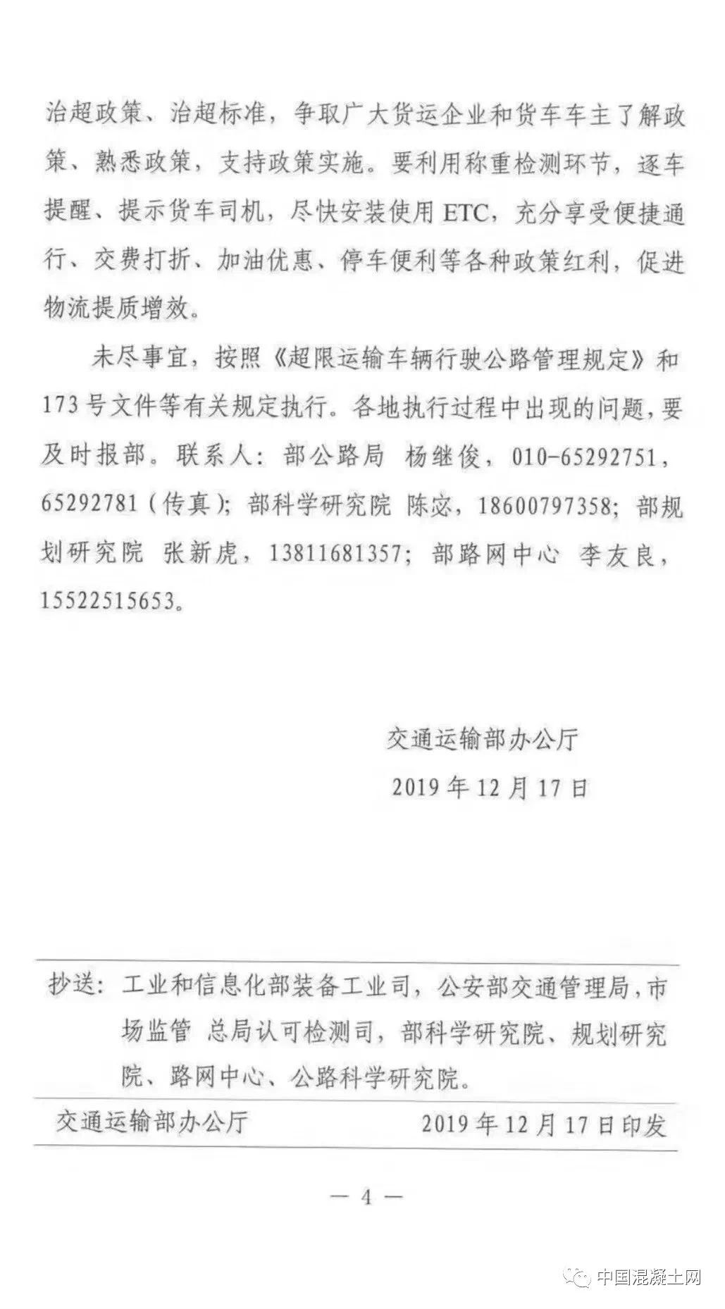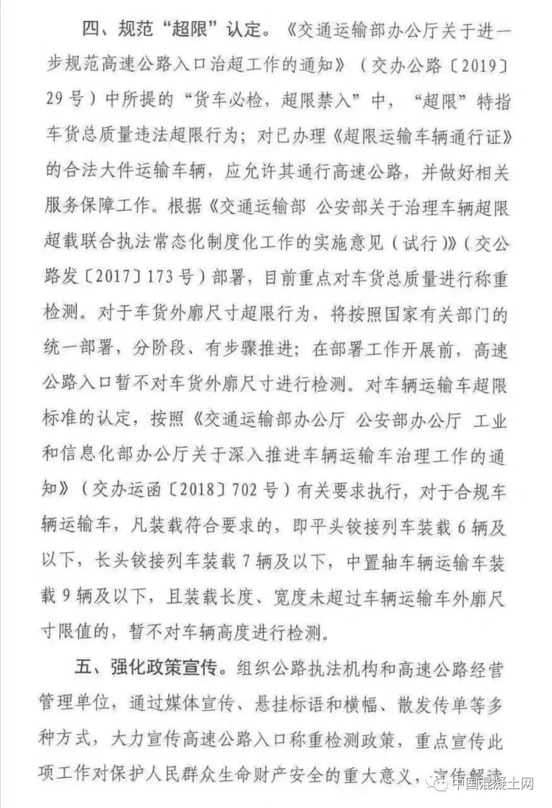 一、嚴(yán)格執(zhí)行全國統(tǒng)一的違法超限超載認(rèn)定標(biāo)準(zhǔn)。嚴(yán)格按照《交通運(yùn)輸部 公安部關(guān)于治理車輛超限超開車聯(lián)合執(zhí)法常態(tài)化制度化工作的實施意見 (試行)》(交公路發(fā)【2017】173號)規(guī)定的《公路貨運(yùn)車輛超限超載認(rèn)定標(biāo)準(zhǔn)》執(zhí)行,嚴(yán)禁隨意提高或者降低認(rèn)定標(biāo)準(zhǔn)。其中,六軸列車驅(qū)動形式為6×4的總質(zhì)量限值為49噸,驅(qū)動形式為6×2的總質(zhì)量限值為46噸。各地不得因驅(qū)動形式為6×4人列車未辦理ETC而簡單按照46噸處理,不得簡化宣傳,出現(xiàn)如“貨車最大總質(zhì)量限定為46噸”宣傳標(biāo)語,造成公眾誤解。對驅(qū)動軸為每軸每則雙輪胎且裝備空氣懸架的3軸、車軸貨車以及4軸鉸接列車總質(zhì)量限值各增加1噸。二、統(tǒng)一合理誤差控制標(biāo)準(zhǔn)。考慮到稱重檢測設(shè)施(設(shè)備)在使用過程中可能出現(xiàn)一定的誤差,對于貨車稱重檢測結(jié)果不大于認(rèn)定標(biāo)準(zhǔn)105%(即超限部分未直如過認(rèn)定標(biāo)準(zhǔn)的5%)的,暫按未超限超載處理。鑒于兩軸貨車數(shù)量多、涉及面廣、情況復(fù)雜。目前,部正在商有關(guān)部門研究制定專項治理方案。在相關(guān)部門統(tǒng)一部署專項治理之前,各地對于車貨總質(zhì)量不超過18噸的兩軸貨車,不得以超限為由禁止其通行高速公路。同時,要做好相關(guān)數(shù)據(jù)的采集與分析工作,為下一步開展專項治理提供支撐。《交通運(yùn)輸部辦公室廳關(guān)于進(jìn)一步規(guī)范高速公路入口治超工作的通知》(交辦公路【2019】29號)中所提的“貨車必檢,超限禁入”中,“超限”特指車貨總質(zhì)量違法超限行為;對已辦理《超限運(yùn)輸車輛通行證》的合法大件運(yùn)輸致車輛,應(yīng)允許其通行高速公路,并做好相關(guān)服務(wù)保障工作。根據(jù)《交通運(yùn)輸部 公安部關(guān)于治理車輛超限超載聯(lián)合執(zhí)法常態(tài)化制度化工作的實施意見(試行)》(交公路發(fā)【2017】173號)部署,目前重點對車貨總質(zhì)量進(jìn)行稱重檢測。對于車貨外廓尺寸超限行為,將按照國家有關(guān)部門的統(tǒng)一部署,分階段、有步驟推進(jìn);在部署工作開展前,高速公路入口暫不對車貨外廓尺寸進(jìn)行檢測。對車輛運(yùn)輸超限標(biāo)準(zhǔn)的認(rèn)定,按照《交通運(yùn)輸 部辦公室廳 公安部辦公室廳 工業(yè)和信息化部辦公室廳關(guān)于深入推進(jìn)車輛運(yùn)輸車治理工作的通知》(交辦運(yùn)【2018】702號)有關(guān)要求執(zhí)行,對于合規(guī)車輛運(yùn)輸車,凡裝載符合要求的,即平頭鉸接列車裝載6輛及以下,長頭鉸接列車裝載7輛及以下,中置軸車輛運(yùn)輸車裝載9輛及以下,且裝載長度、寬度未超過車輛運(yùn)輸車外廓尺寸限值的,暫不對車輛高度進(jìn)行檢測。組織公路執(zhí)法機(jī)構(gòu)和高速公路經(jīng)營管理單位,通過媒體宣傳、懸掛標(biāo)語和橫幅、散發(fā)傳單等多種方式,大力宣傳高速公路入口稱重檢測政策,重點宣傳此項工作對保護(hù) 人民群眾生命財產(chǎn)安全的重大意義 ,宣傳解讀治超政策、治超標(biāo)準(zhǔn),爭取廣大貨運(yùn)企業(yè)和貨車車主了解政策、熟悉政策,支持政策實施。要利用稱重檢測環(huán)節(jié),逐車提醒、提示貨車司機(jī),盡快安裝ETC,充分享受便捷通行、交費(fèi)打折、加油優(yōu)惠、車便利等各種政策紅利,促進(jìn)物流提質(zhì)增效。未盡事宜,按照《超限運(yùn)輸車輛行駛公路管理規(guī)定》和173號文件等有關(guān)規(guī)定執(zhí)行。各地執(zhí)行過程中出現(xiàn)的要及時報部。全國物流標(biāo)準(zhǔn)非常混亂,地方標(biāo)準(zhǔn)與國家標(biāo)準(zhǔn)經(jīng)?!按蚣堋?,導(dǎo)致全國物流司機(jī)苦不堪言,而此次交通廳像各省運(yùn)輸廳發(fā)布特急文件通知,劍指就是統(tǒng)一運(yùn)輸車輛載重的標(biāo)準(zhǔn),令運(yùn)輸行業(yè)向制度化,規(guī)范化過渡。同時從根源上徹底清除“亂收費(fèi)”現(xiàn)象,并發(fā)布問題反映電話:部科學(xué)研究院:陳宓 18600797358部規(guī)劃院:張新虎 13811681357部路網(wǎng)中心:李友良 15522515653