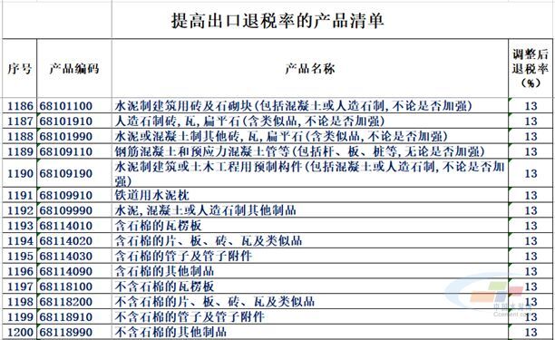 其中,水泥制建筑用磚及石砌塊(包括混凝土或人造石制,不論是否加強(qiáng));水泥或混凝土制其他磚,瓦,扁平石(含類似品,不論是否加強(qiáng));鋼筋混凝土和預(yù)應(yīng)力混凝土管等(包括桿、板、樁等,無(wú)論是否加強(qiáng));水泥制建筑或土木工程用預(yù)制構(gòu)件(包括混凝土或人造石制,不論是否加強(qiáng));鐵道用水泥枕;水泥,混凝土或人造石制其他制品等均被列入產(chǎn)品出口退稅清單中,且調(diào)整后退稅率均為13%。