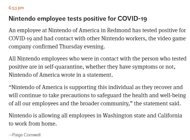 根據(jù)《西雅圖時(shí)報(bào)》的相關(guān)報(bào)道,美國任天堂一名員工目前已經(jīng)出現(xiàn)“新冠病毒檢測陽性”的狀況,目前,與這位員工有過接觸的其他人員已經(jīng)開始自我隔離。《西雅圖時(shí)報(bào)》報(bào)道原文: