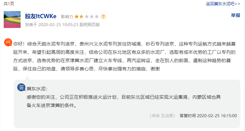 日前有股友在上市公司平臺(tái)向冀東水泥提問并建議:稱綜合天皓水泥專列進(jìn)京,貴州興義水泥專列發(fā)往防城港,砂石專列進(jìn)京,這種專列運(yùn)輸方式越來越蔓延開來,希望引起高層的高度關(guān)注。