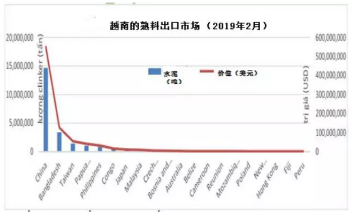 2019年,中國大陸是越南熟料水泥的主要市場(chǎng)占其市場(chǎng)份額的40.46%,達(dá)到631萬噸,價(jià)值248.19百萬美元。