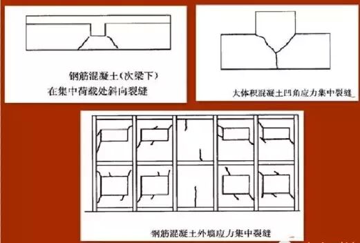 裂縫一般特征: 應(yīng)力集中裂縫一般發(fā)生在門窗洞口的角部和平立面突出凹進(jìn)的轉(zhuǎn)角處,且斜向楔形狀裂縫居多。在集中荷載較大的部位,易產(chǎn)生劈裂狀的裂縫。在預(yù)應(yīng)力結(jié)構(gòu)錨固端的局部承壓處,有時(shí)出現(xiàn)一條或數(shù)條裂縫,并呈放射形狀。