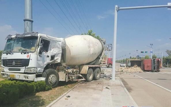 當日,劉某駕駛混凝土攪拌車在南海新區(qū)沿著龍海路由北向南行駛,行至龍海路與海韻路交會處闖紅燈行駛,與沿海韻路由東向西正常行駛的大貨車發(fā)生碰撞,導致大貨車翻車,拉載的石塊散落一地?;炷翑嚢柢噭t沖進了路邊綠化帶內(nèi),將兩棵行道樹和一根燈桿撞倒,路邊人行道上的部分石板被掀起。