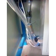 將膩?zhàn)臃郯b袋套在出料嘴上,撥動(dòng)彈簧開關(guān),壓袋氣缸開始工作并壓住袋口,控制器將包裝袋重量自動(dòng)去除,通過(guò)空壓機(jī)的氣流經(jīng)三分管分成三路,其中一路去往進(jìn)料口進(jìn)行破拱,保證下料暢通。葉輪高速轉(zhuǎn)動(dòng)迅速將物料撥出灌入袋中,隨袋中空氣一起溢出的粉塵經(jīng)排氣孔排出(對(duì)環(huán)保要求高的用戶也可連接吸塵器,由除塵器吸走)。待加料達(dá)到粗流設(shè)定值(L1)時(shí),氣缸自動(dòng)將橡膠軟管夾至1/2開口,出料速度減慢,到總設(shè)定(L2)時(shí),氣缸將橡膠軟管完全夾死,出料停止,壓袋氣缸松開袋口,灌裝結(jié)束。