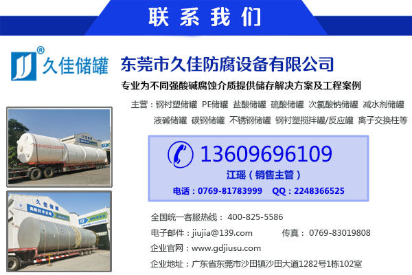 鹽酸屬于一元無機強酸,工業(yè)用途廣泛。鹽酸的性狀為無色透明的液體,有強烈的刺鼻氣味,具有較高的腐蝕性,盛有濃鹽酸的容器打開,氣體會揮發(fā),與空氣中的水蒸氣結(jié)合產(chǎn)生鹽酸小液滴,使瓶口上方出現(xiàn)酸霧。因鹽酸的強腐蝕性,且隨濃度溫度的增加而增加,因此在鹽酸罐的選材上面必須特別嚴謹,一般非金屬對其有很好的抗腐蝕性,在常溫條件下,可選用性價比較高的塑料儲罐,久佳塑料儲罐可用盛裝各種濃度的工業(yè)級鹽酸和試劑級鹽酸,特別適用于試劑級鹽酸的儲存。