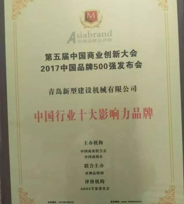 2017年5月31日,以“新品牌、新供給、新未來”為主題的第五屆中國商業(yè)創(chuàng)新大會(huì)暨2017中國品牌500強(qiáng)發(fā)布會(huì)在北京國家會(huì)議中心隆重舉行。建筑機(jī)械行業(yè)知名企業(yè)中青林集團(tuán)旗下青島新型建設(shè)機(jī)械有限公司受邀參會(huì),一舉榮獲“中國行業(yè)十大創(chuàng)新力品牌”與“中國行業(yè)十大影響力品牌”。