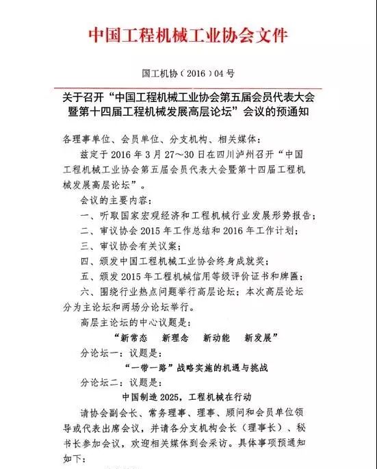 茲定于2016年3月27日~30日在四川瀘州召開“中國工程機械工業(yè)協(xié)會第五屆會員代表大會暨第十四屆工程機械發(fā)展高層論壇”。